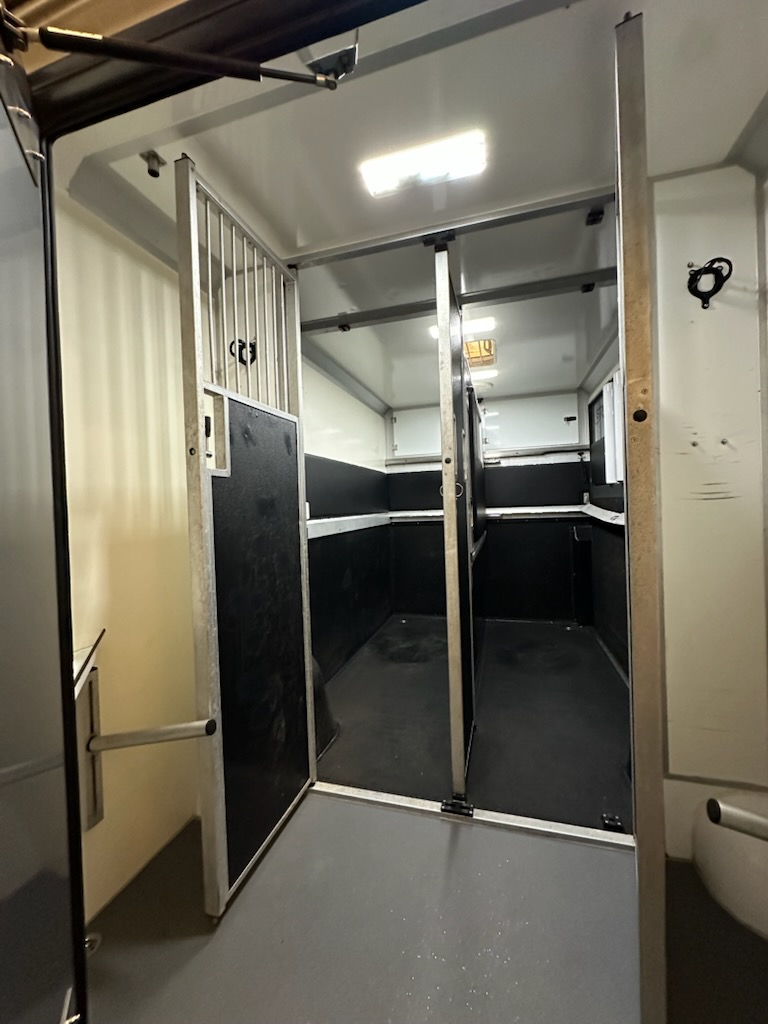 Fasta väggar mellan hästarna ger extra skydd och stabilitet under färd.
